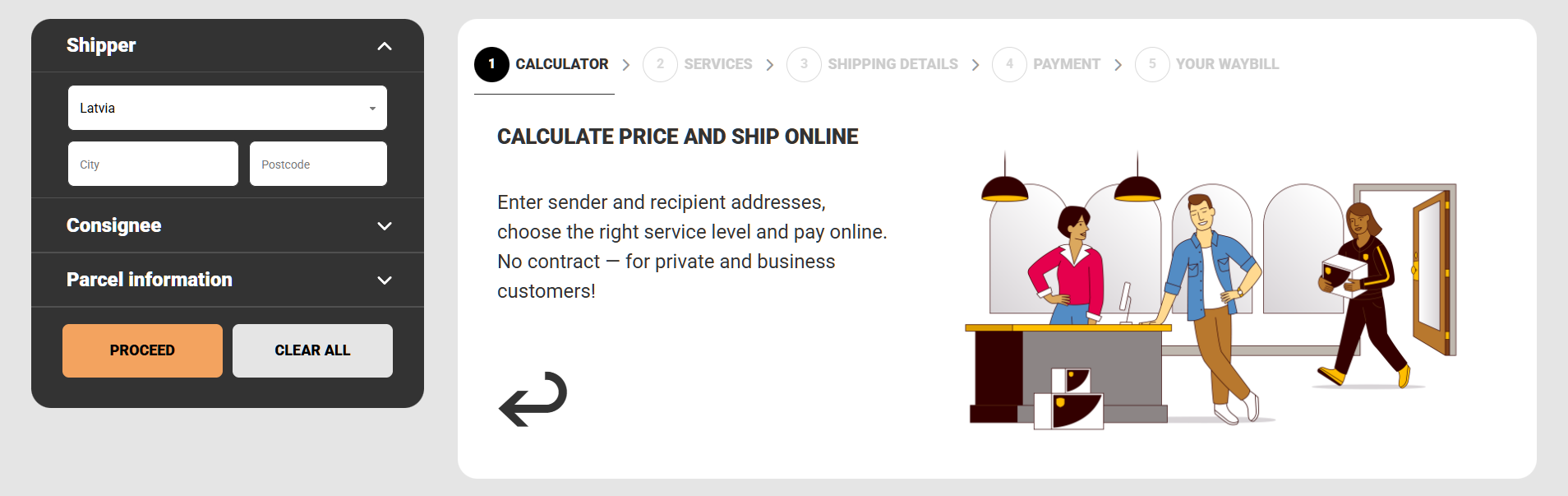 Подтверждение деталей отправления, выбор услуги вызова курьера, оплата удобным способом (кредитная карта, интернет-банк, PayPal, Apple Pay).