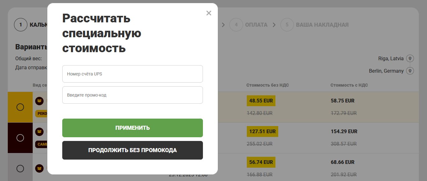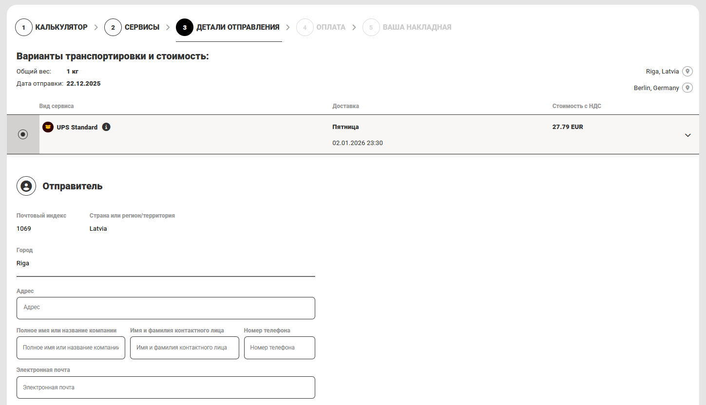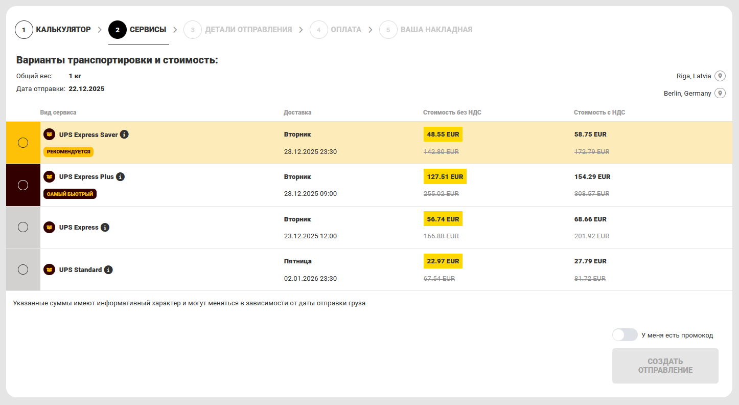 Fromme.cc предлагает удобный способ расчёта стоимости доставки для экспортных, импортных и внутренних отправлений с последующим оформлением и оплатой услуги онлайн. Система учитывает базовые тарифы и индивидуальные скидки договорных клиентов авторизованных сервис контракторов UPS – UPS ASC. Для клиентов без договора имеется возможность предоставлять тарифы с приветственной скидкой — Welcome bonus.